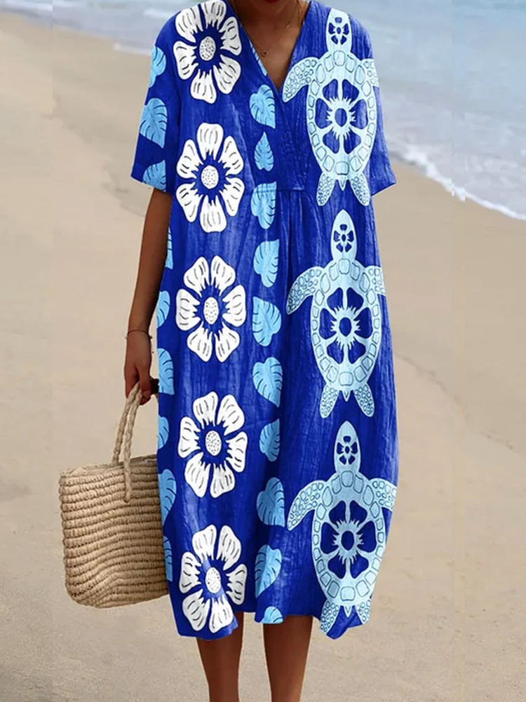 Split Joint V Neck Ocean Sea Turtle Printed Dresses
