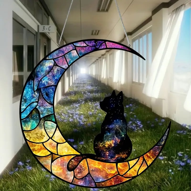 🌙🐾 A Glimpse into the Universe – Featuring a colorful moon and a black cat with a galaxy on its back, this Moon & Black Cat Stained Art Ornament brings mystery and magic to any space.