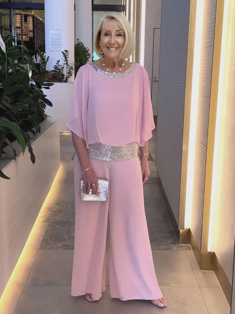 Stand out in this elegant, soft, feminine pink suit with sequin embellishments!