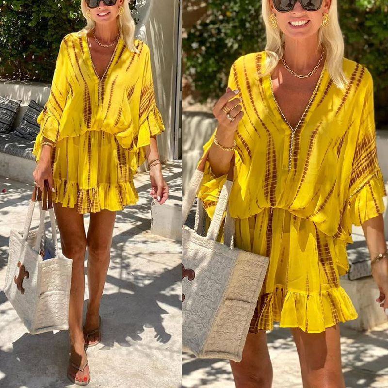 Women'S V-Neck Diamond Print Bat Sleeve Chiffon Loose Dress