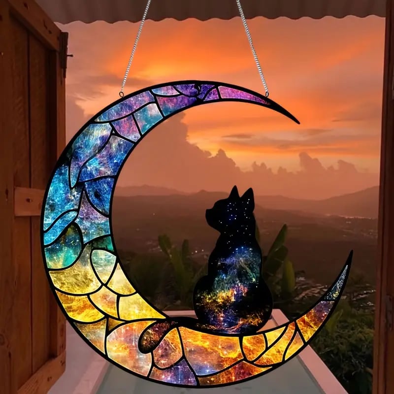 🌙🐾 A Glimpse into the Universe – Featuring a colorful moon and a black cat with a galaxy on its back, this Moon & Black Cat Stained Art Ornament brings mystery and magic to any space.