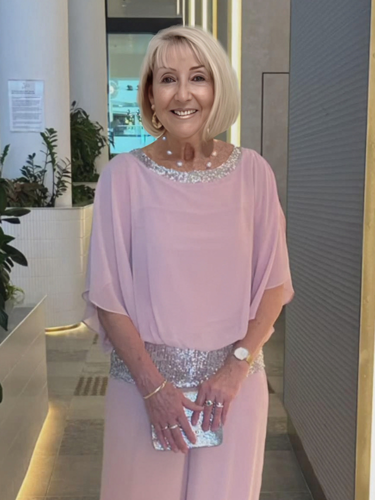 Stand out in this elegant, soft, feminine pink suit with sequin embellishments!